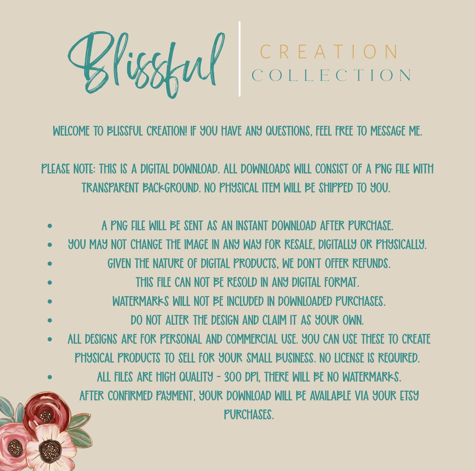 * After confirmed payment, your download will be available via your Etsy purchases.